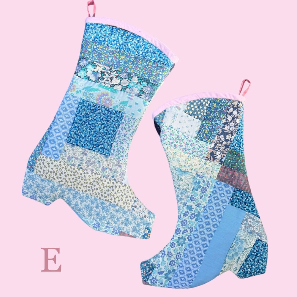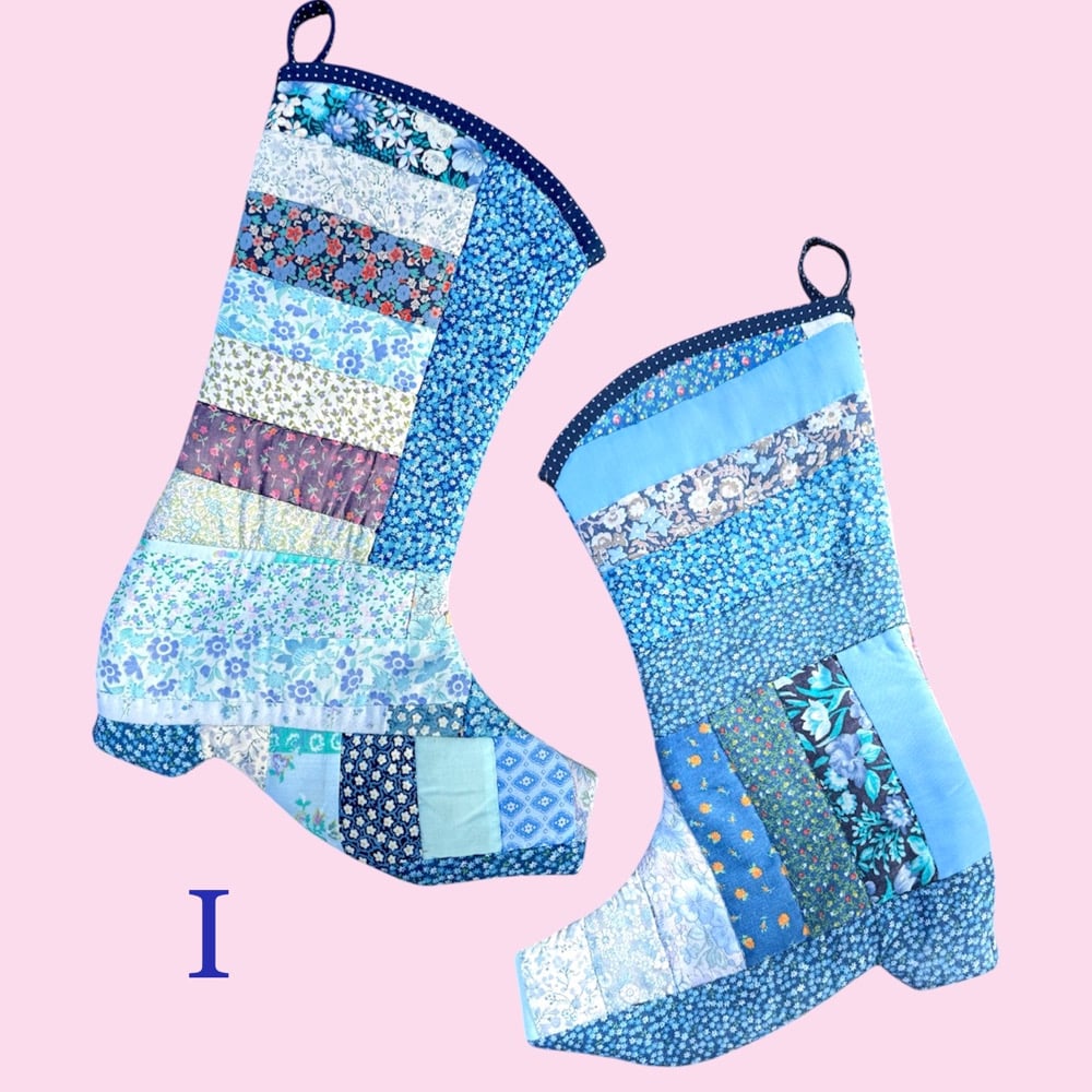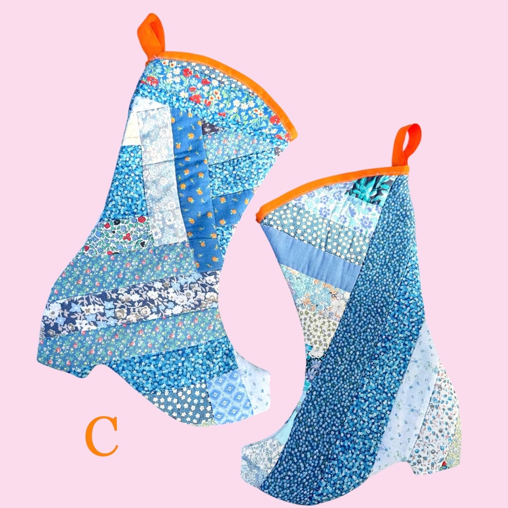 Cowboy boot stocking made from an upcycled quilt (circa 1930s) and handmade binding.