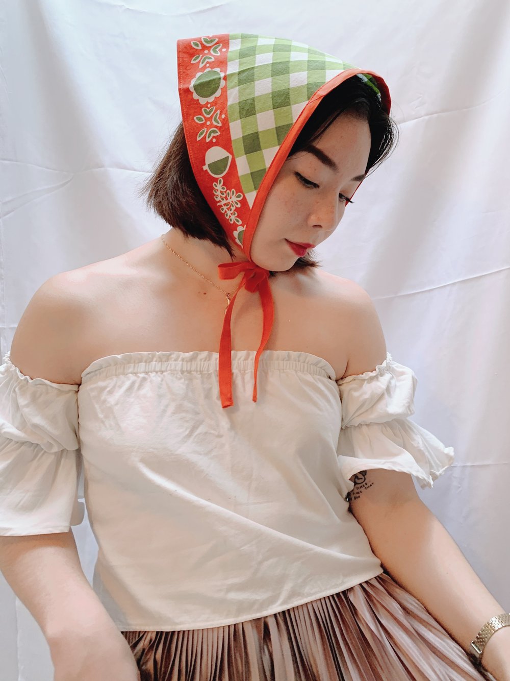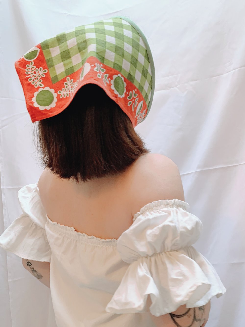 Headscarf with fully adjustable ties at the chin. Can also be worn around the neck as a bandana scarf. Made from upcycled vintage cotton with green checkered pattern and folk motifs. Two color variations for ties available (sage green or orange).