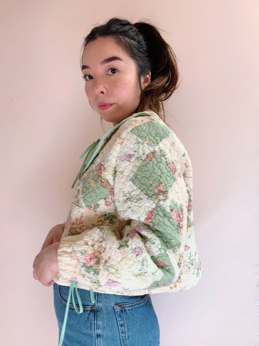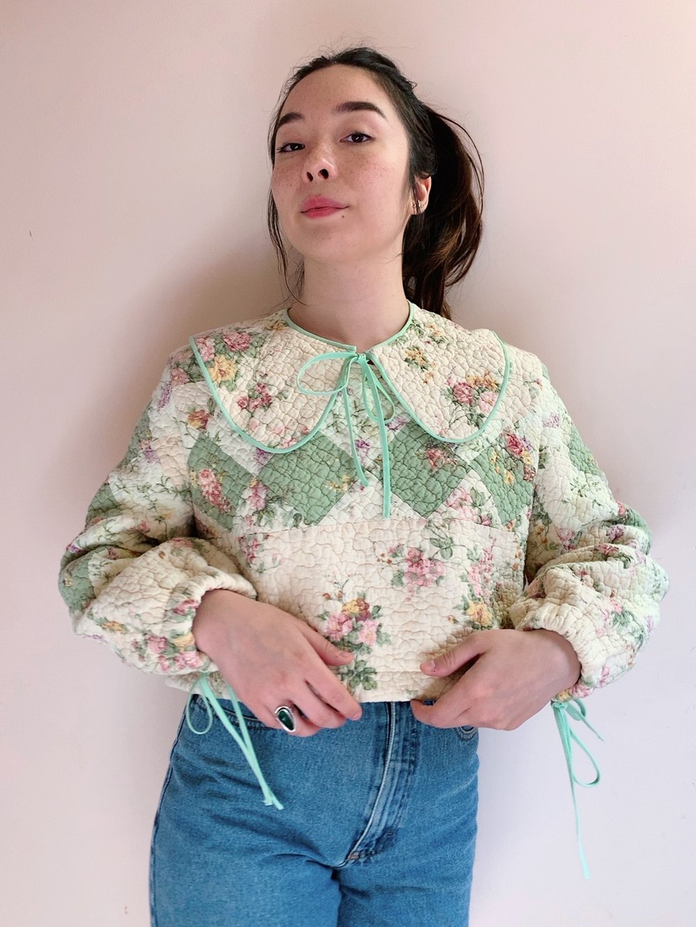 Boat neck boxy semi-cropped length top with long sleeves. Light cream and ditsy Laura Ashely type floral print quilt with sage green diamonds. Straight across hem and elastic at sleeves. Comes with a matching detachable collar. Made from upcycled handmade light-medium weight quilt circa 1980s/90s.