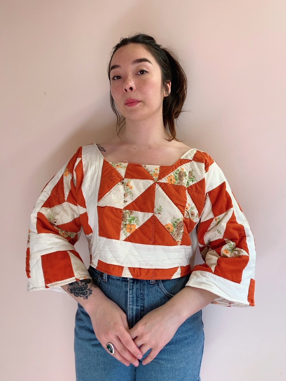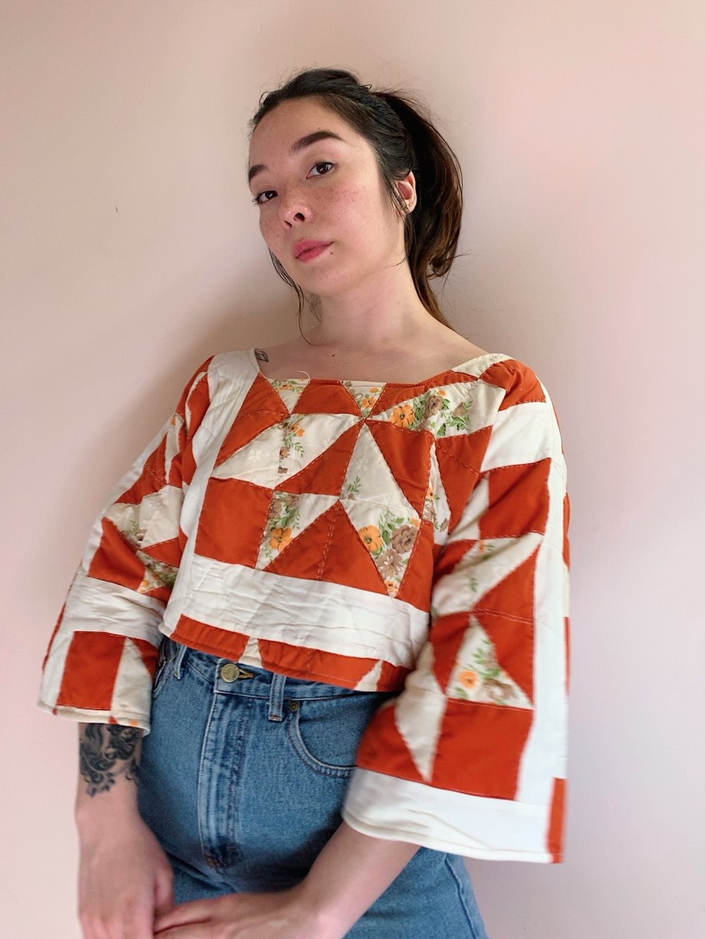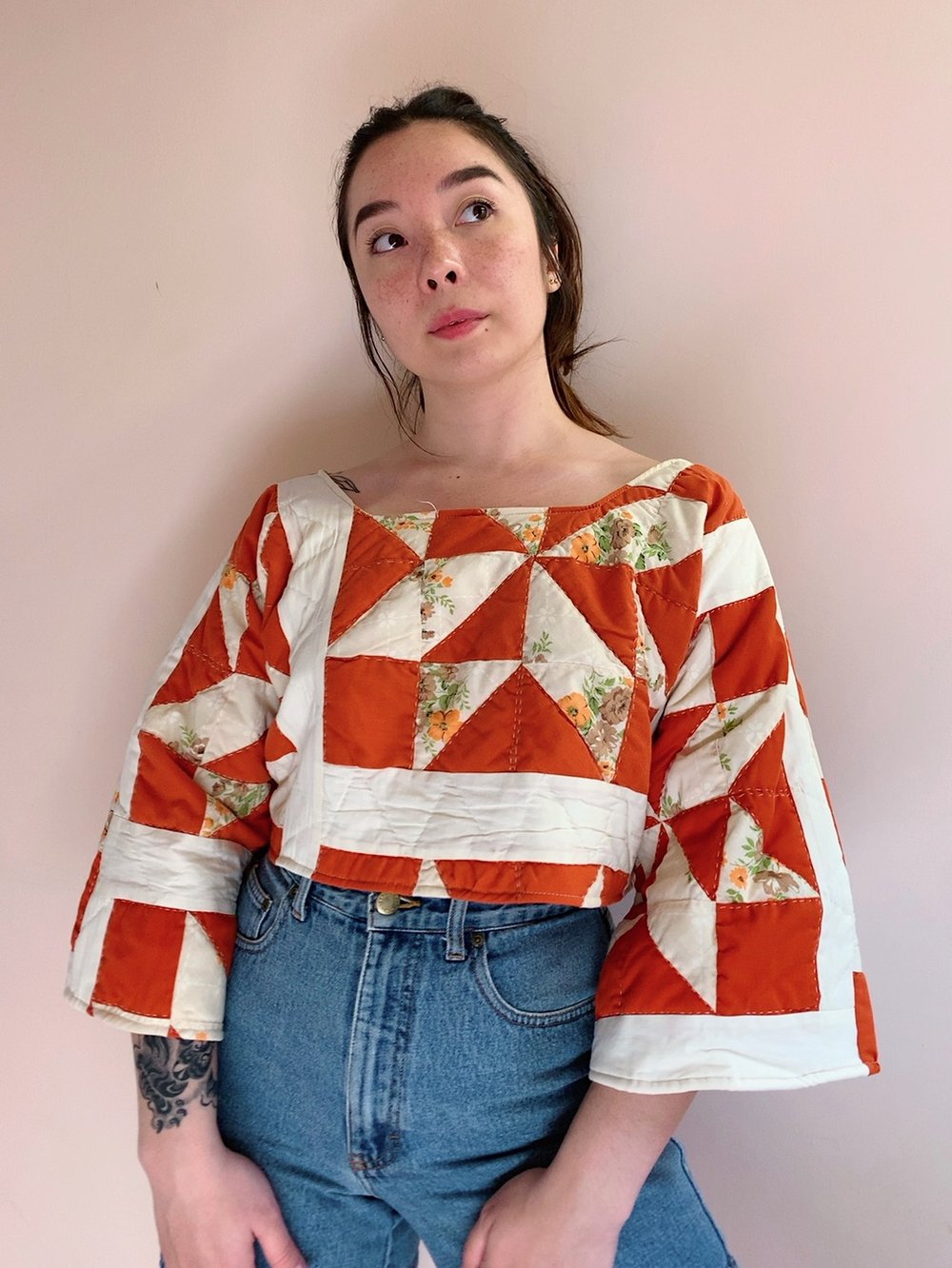 Square neck boxy cropped length top with long bell sleeves. Light cream and orange lemon/sawtooth star quilt pattern. Straight across hem. Made from upcycled handmade light-medium weight quilt circa 1970s.