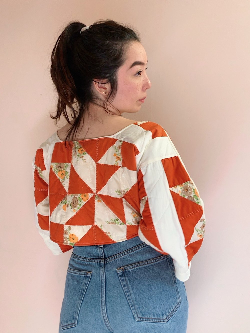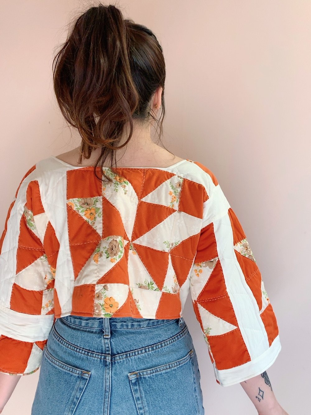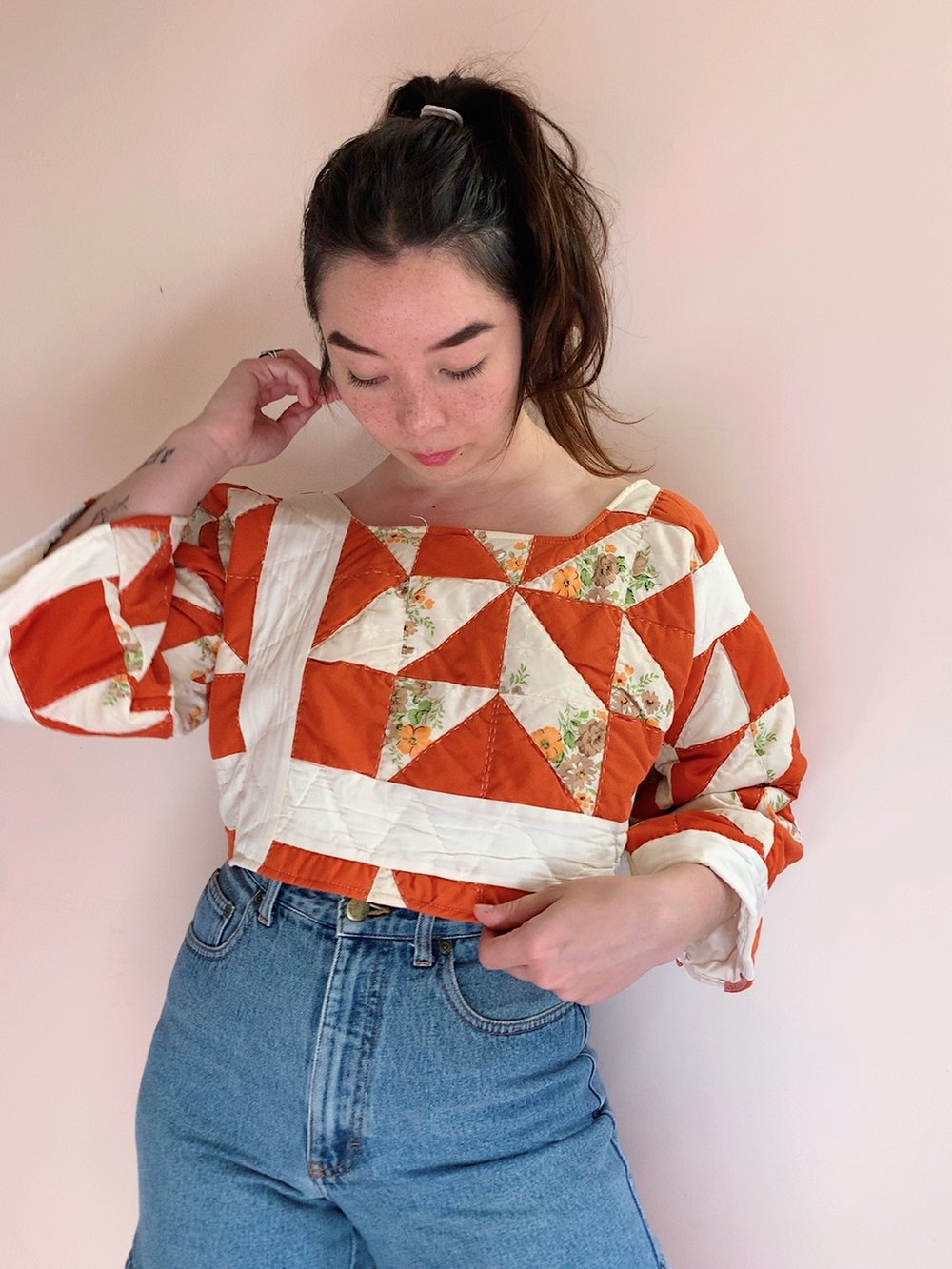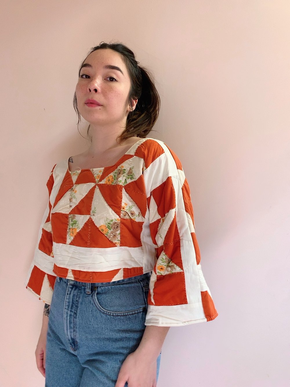 Square neck boxy cropped length top with long bell sleeves. Light cream and orange lemon/sawtooth star quilt pattern. Straight across hem. Made from upcycled handmade light-medium weight quilt circa 1970s.