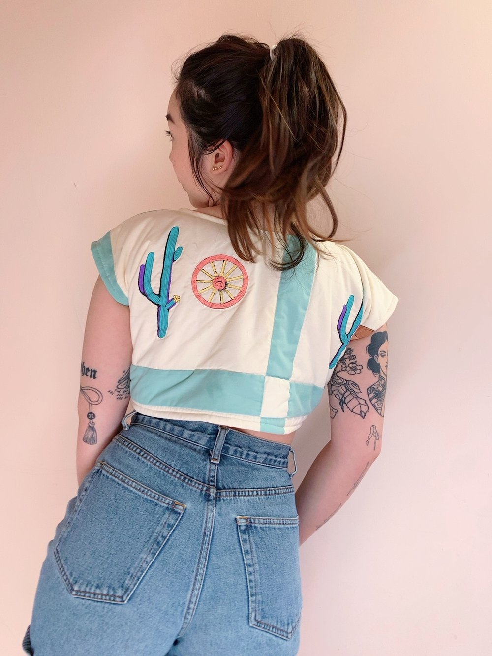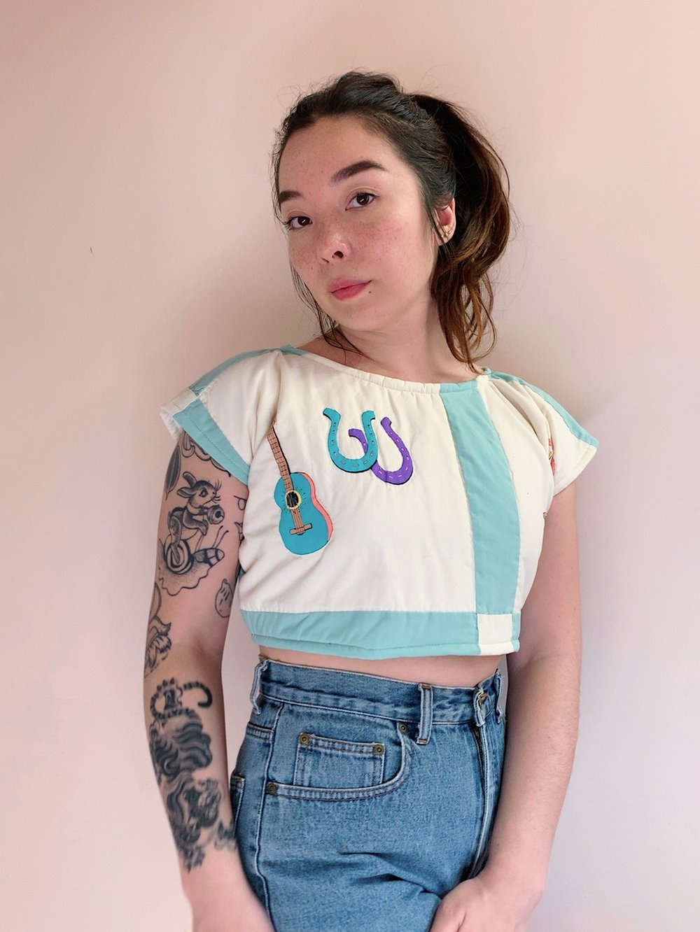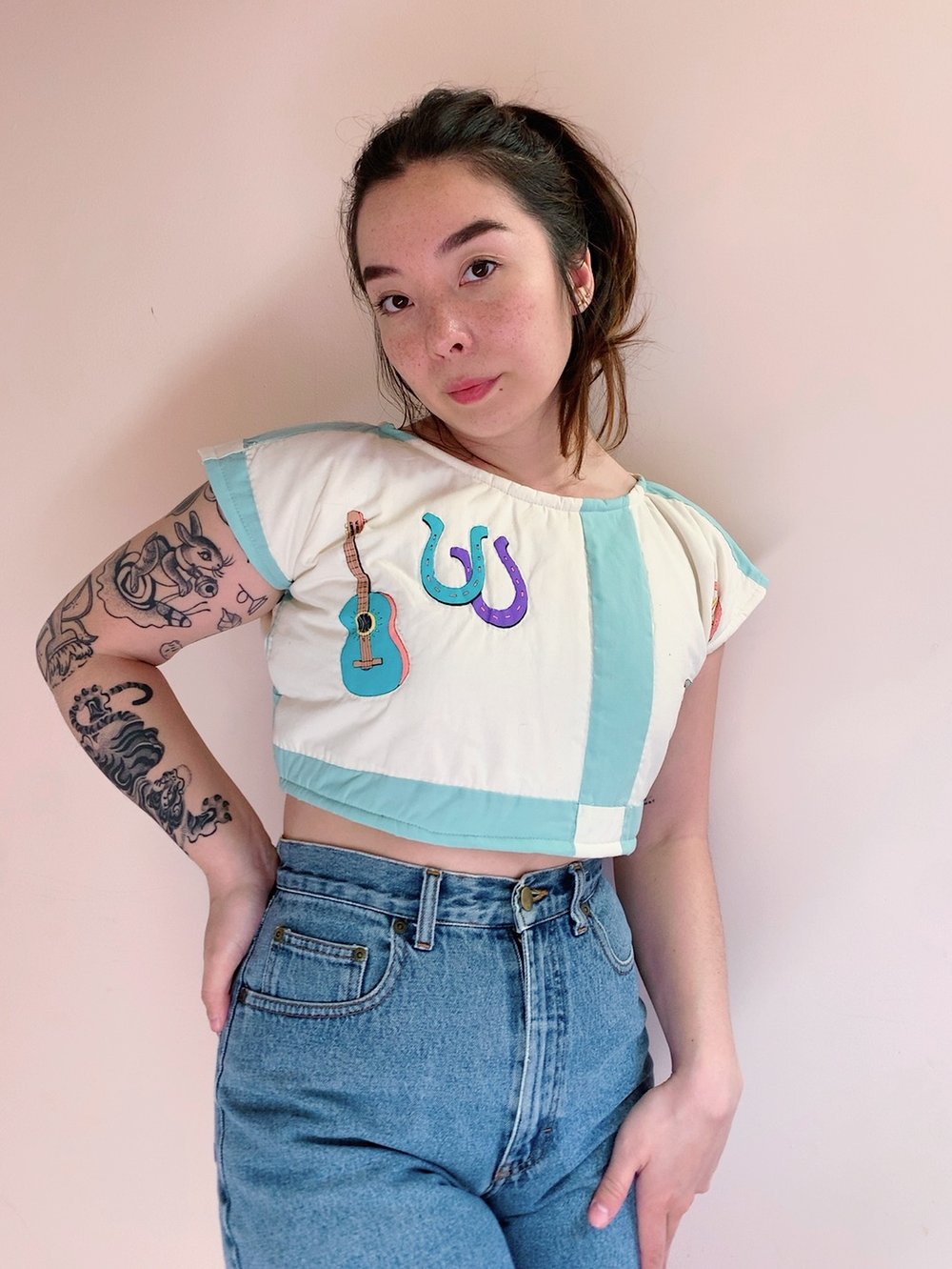 Boat neck boxy cropped length top with short sleeves. Light cream and mint green quilt with western/cowboy motifs. Straight across hem. Made from upcycled handmade light-medium weight quilt circa 1980s.