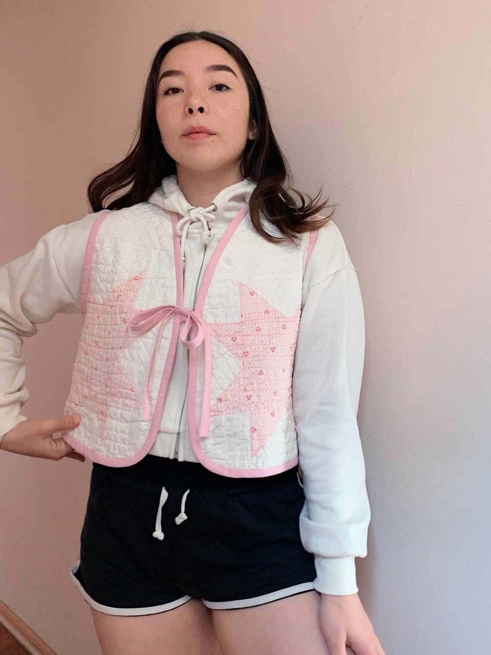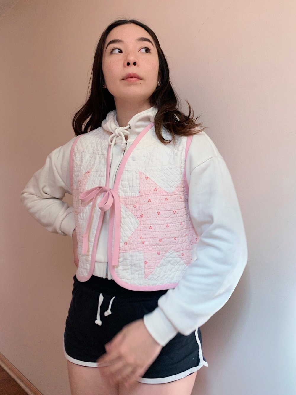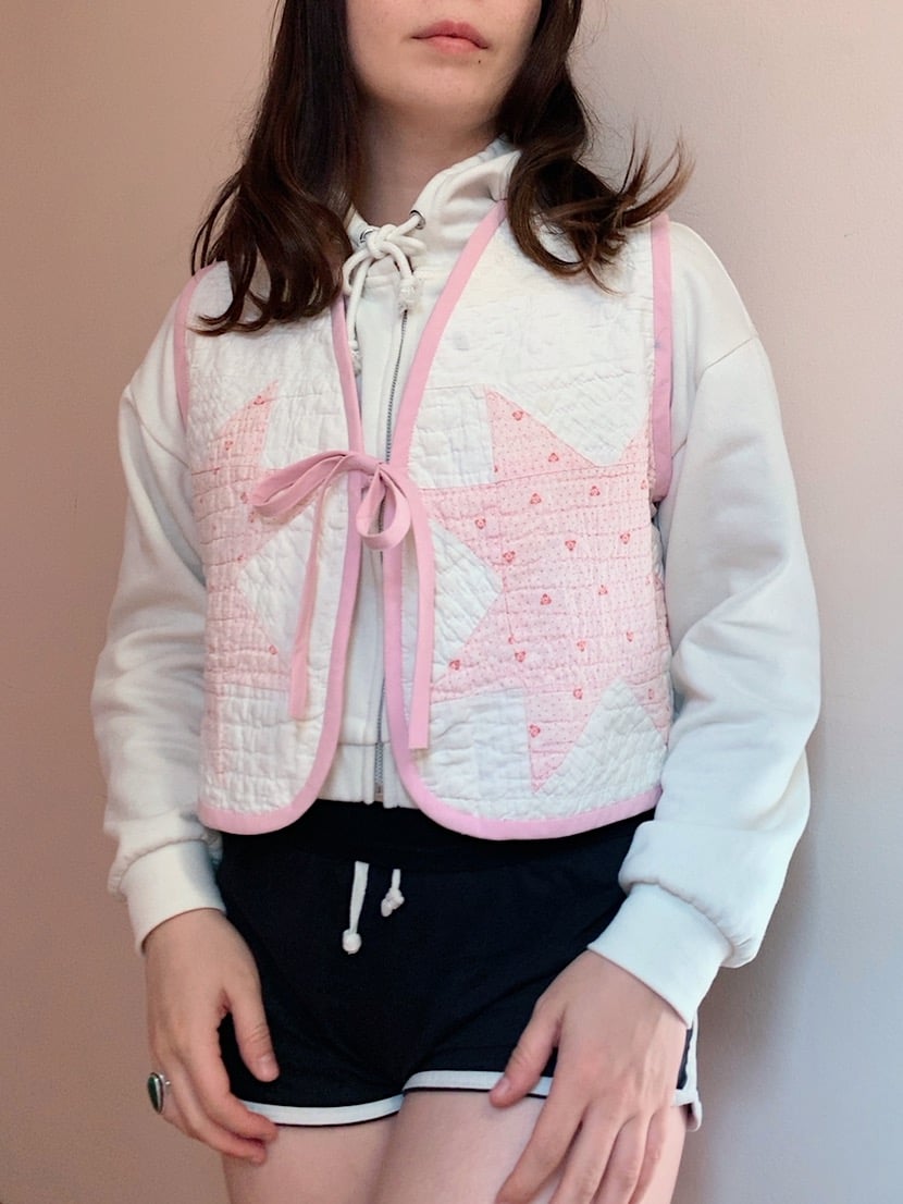 Slightly cropped boxy fit vest with baby pink trim and front ties. Upcycled from a vintage hand-stitched blue patchwork quilt with checkered square pattern. The quilt has a layer of medium-light batting which makes it the perfect layering piece for any weather.