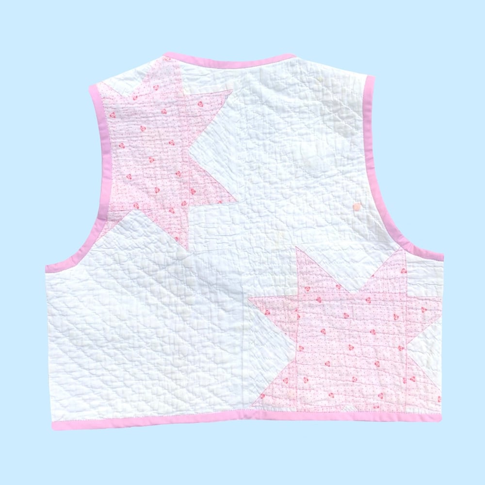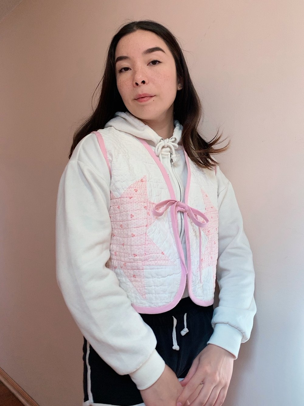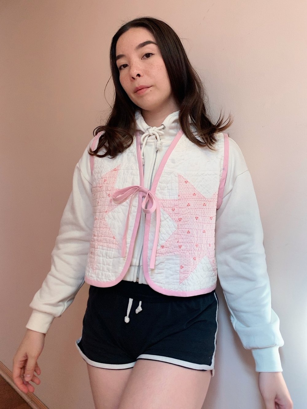 Slightly cropped boxy fit vest with baby pink trim and front ties. Upcycled from a vintage hand-stitched blue patchwork quilt with checkered square pattern. The quilt has a layer of medium-light batting which makes it the perfect layering piece for any weather.