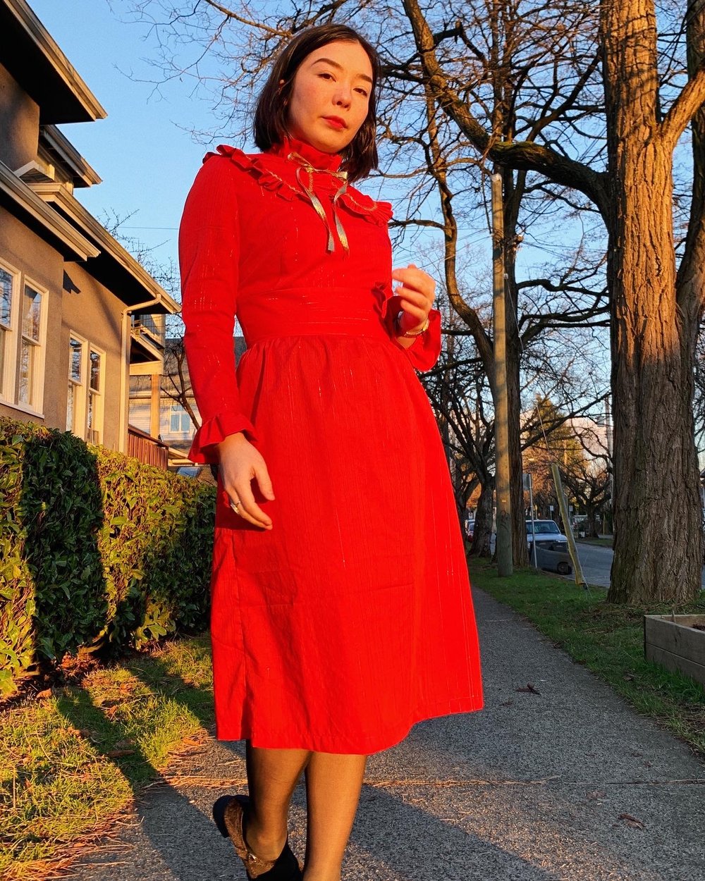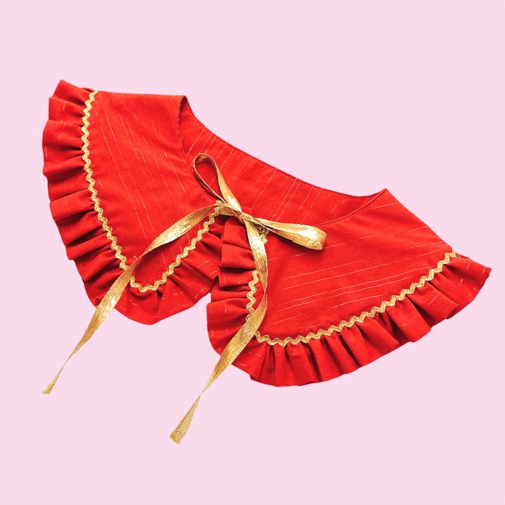 Form fitting dress with long, straight sleeves. Gathered skirt and zip-up back. Ruffled neckline and sleeve hems. Made from upcycled red poly cotton blend with shiny metallic red pinstripes. Comes with a matching fully reversible detachable ruffle collar with gold ties & gold ric rac detailing.