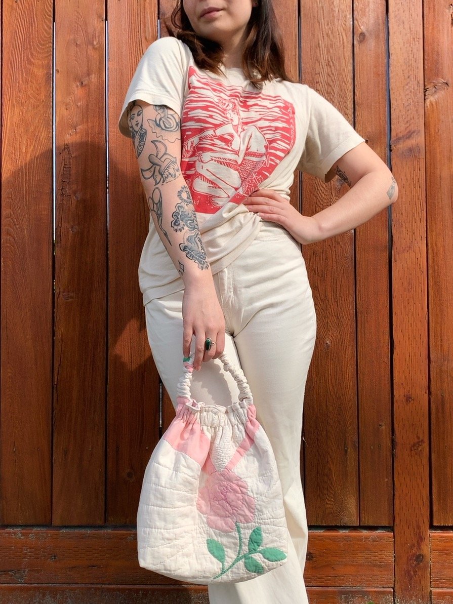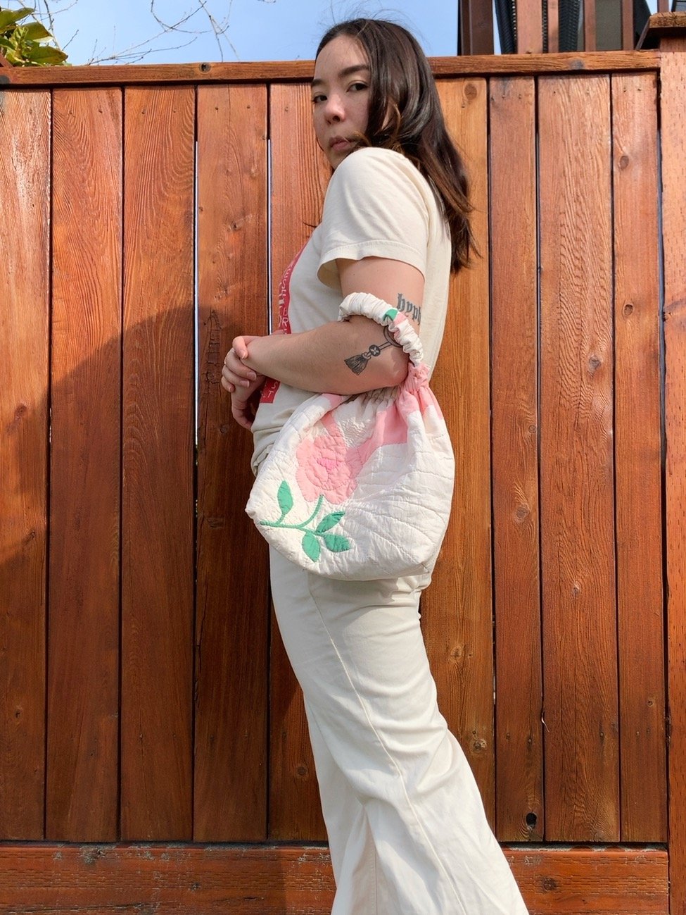 Mini pouch bag with scrunchie handle and elasticized opening. Upcycled from an antique quilt circa early 1900s, with a hand-stitched roses motif. Holds all the essentials and more!
