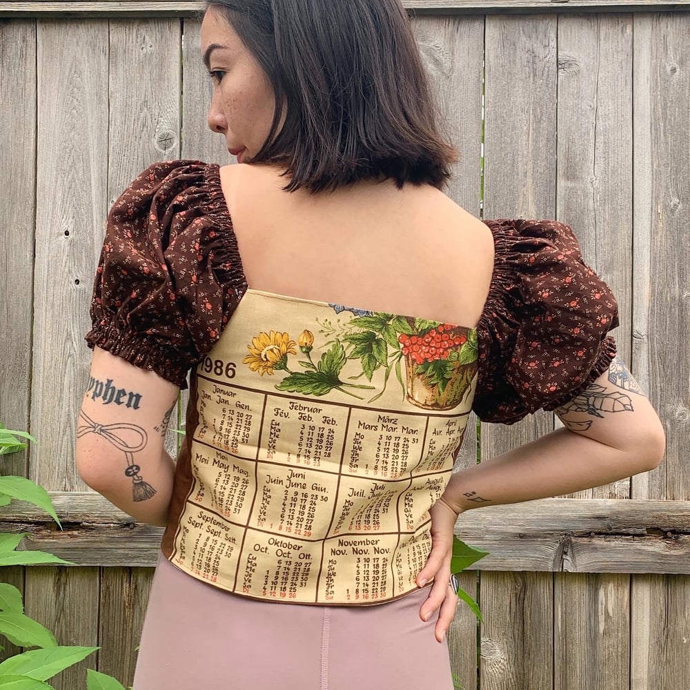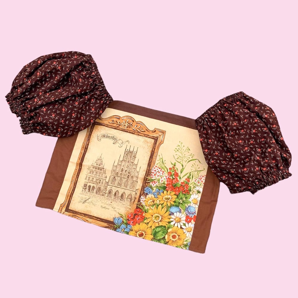 Puff sleeve blouse with hexagonally framed bodice neckline. Half length sleeves and regular length bodice. Elastic shoulders and sleeve openings. Made from an upcycled vintage 100% linen tea towel circa 1960s/70s for the bodice. Sleeves were made from upcycled cotton with brown ditsy flower print.