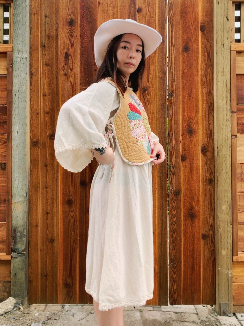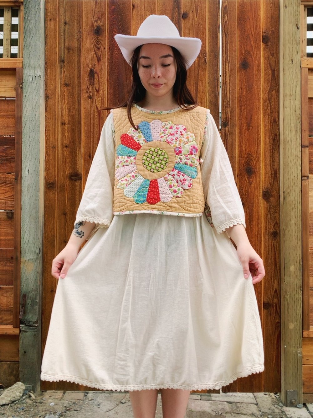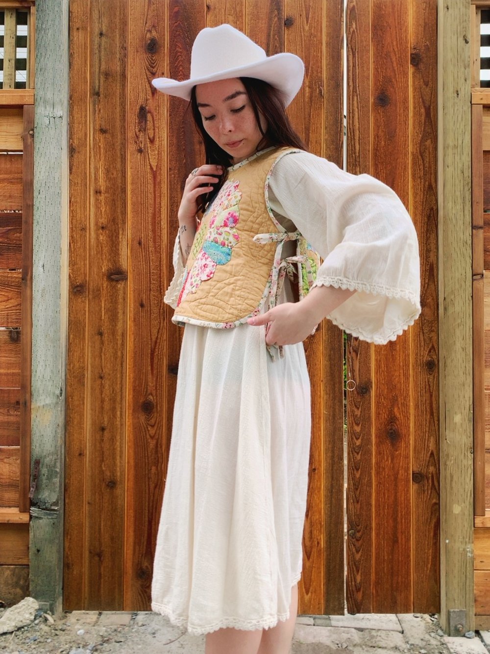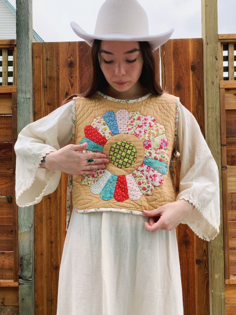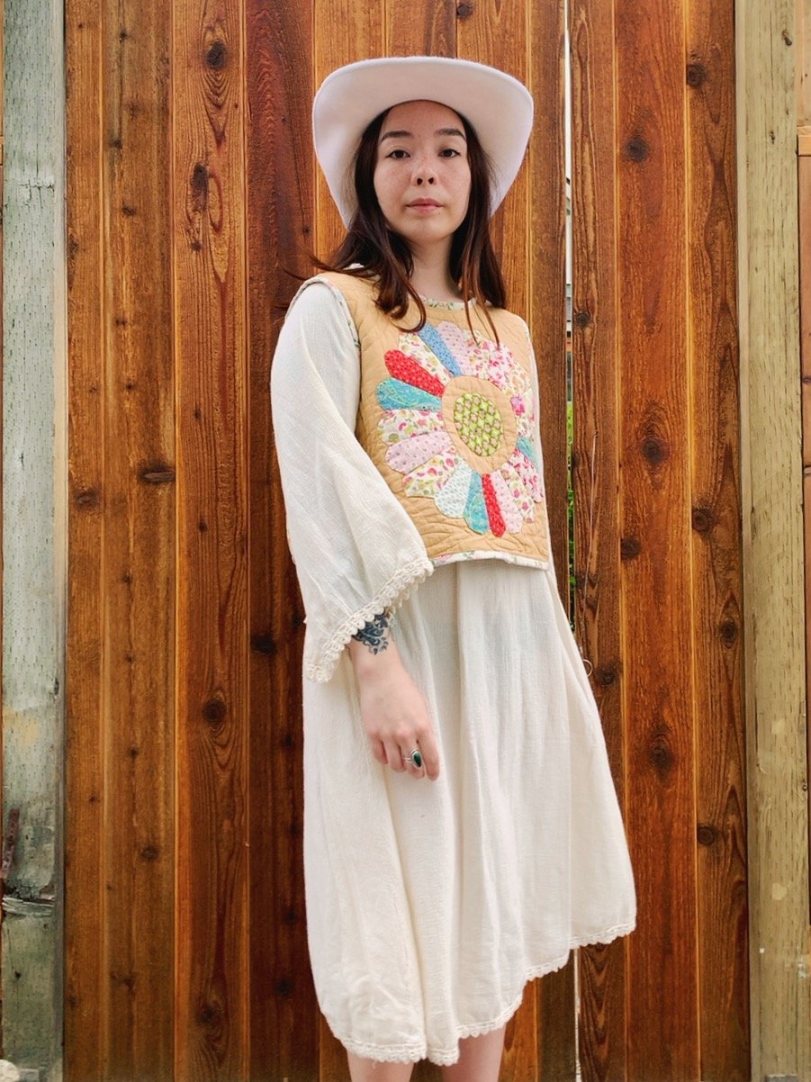 Sleeveless crop length vest with two sets of side ties on each side. Upcycled from a reclaimed vintage antique hand-stitched quilt with Dresden plate pattern, circa early 1900s. Quilt has a medium-light layer of batting which makes it the perfect layering piece. Completely front to back reversible.