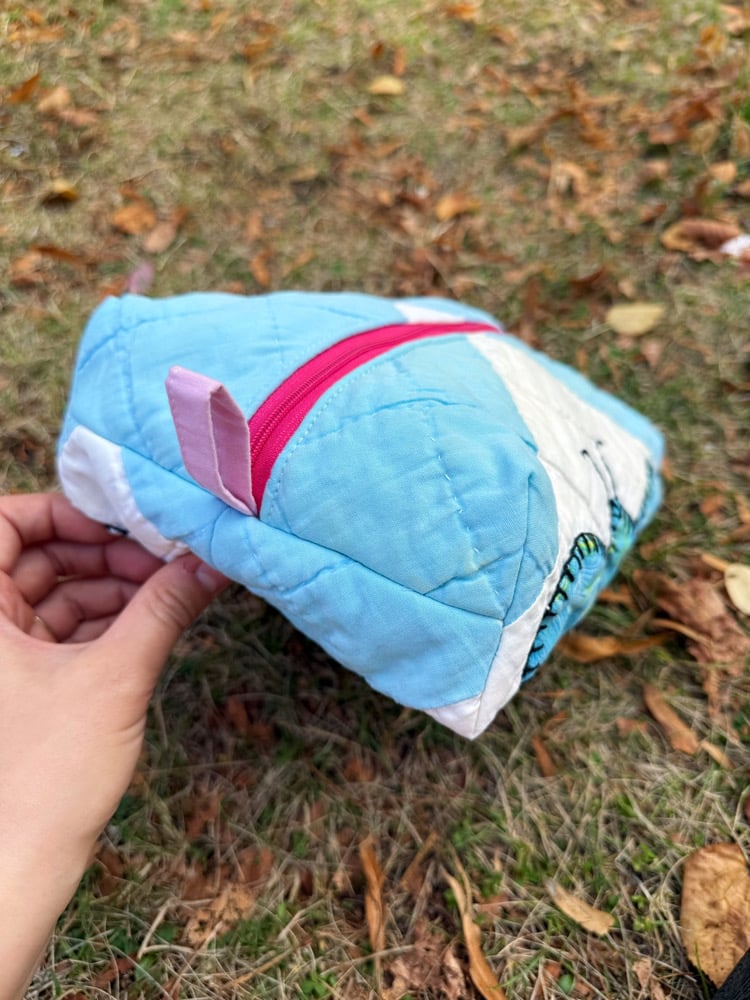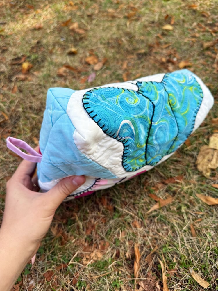 Large size zippered pouch with pull tab on each end. Fully lined & reversible. Made from upcycled vintage quilts and lining fabrics.
