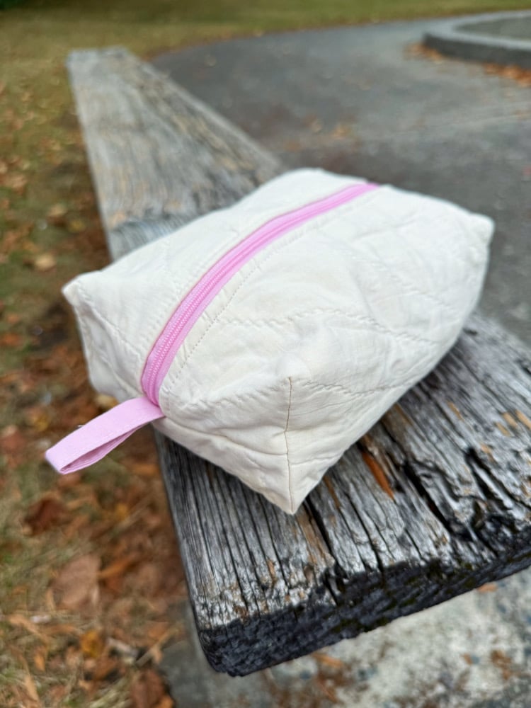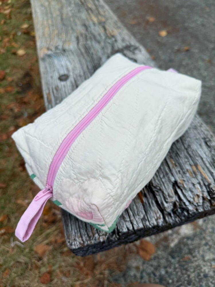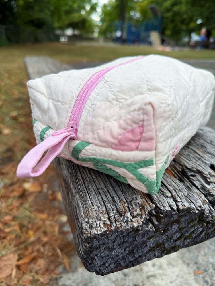 Medium size zippered pouch with pull tab on both ends. Fully lined & reversible. Made from upcycled vintage quilts and lining fabrics.