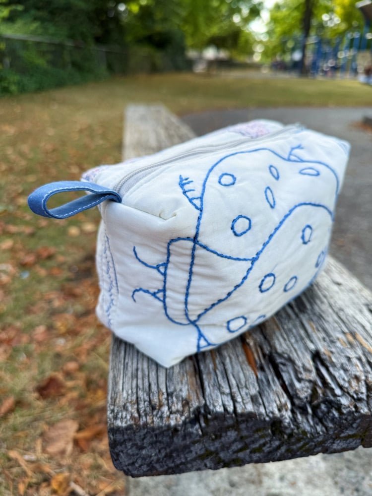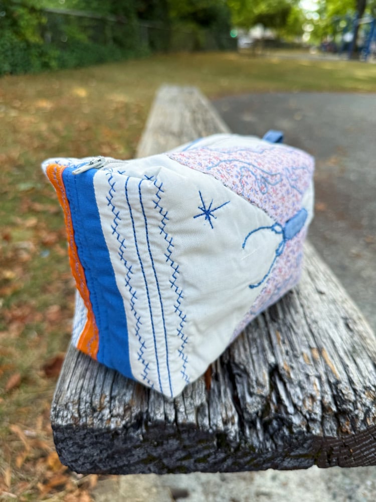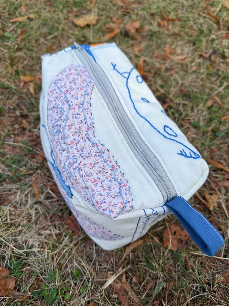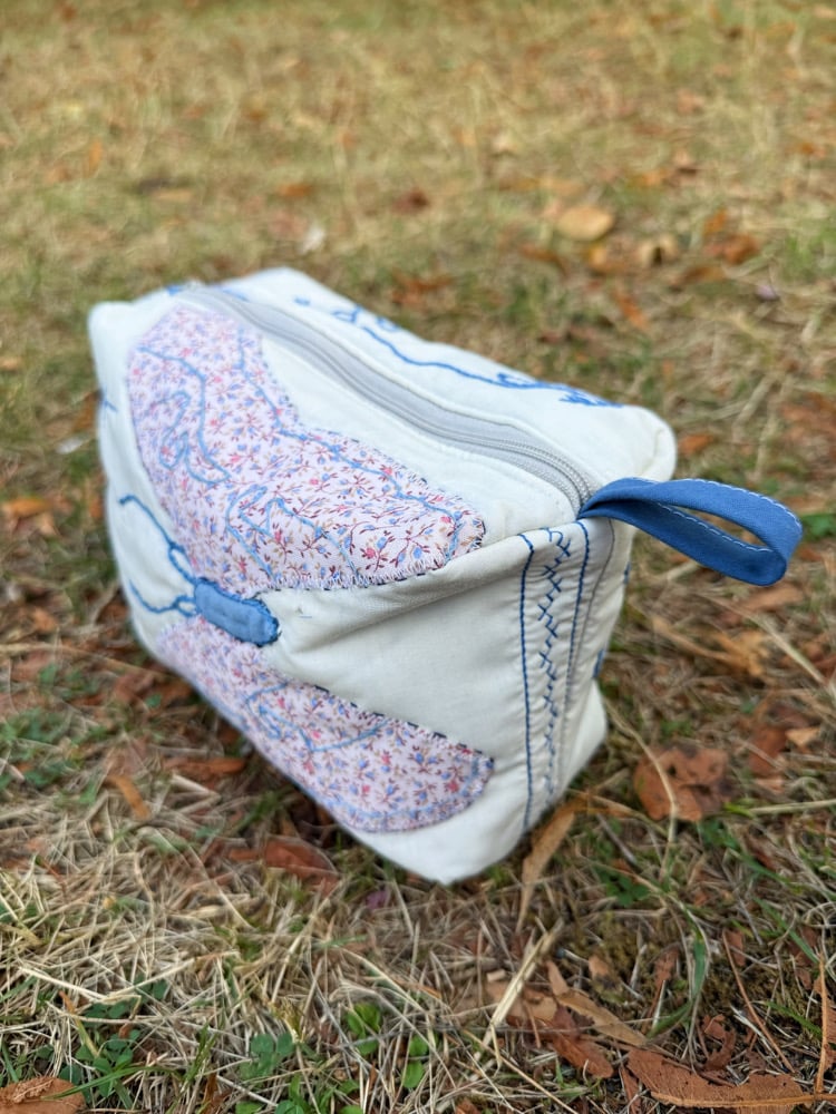 Medium size zippered pouch with pull tab on one end. Fully lined & reversible. Made from upcycled vintage quilts and lining fabrics.