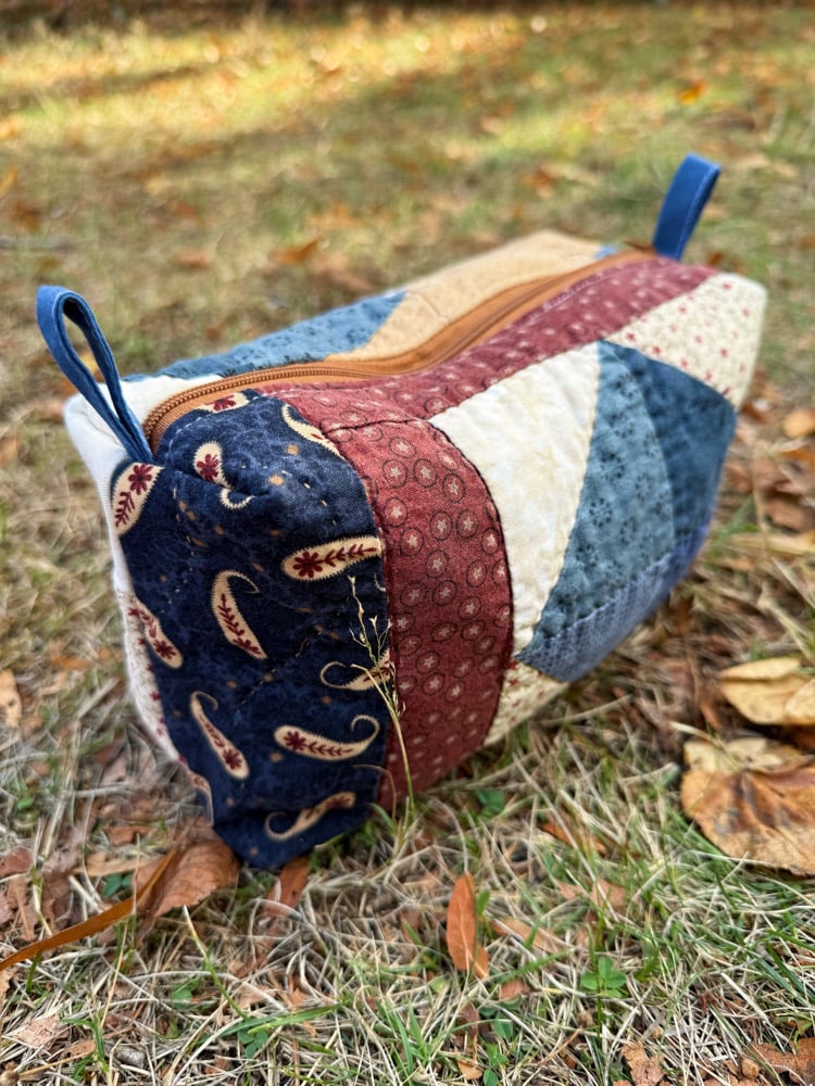 Medium size zippered pouch with pull tab on one end. Fully lined & reversible. Made from upcycled vintage quilts and lining fabrics.